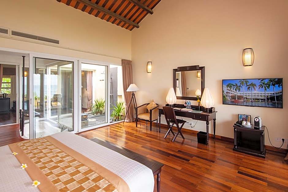 Overlooking the ocean, this spacious suite features an outdoor shower, an attached bathroom with spa bath and private balcony with sun lounges.